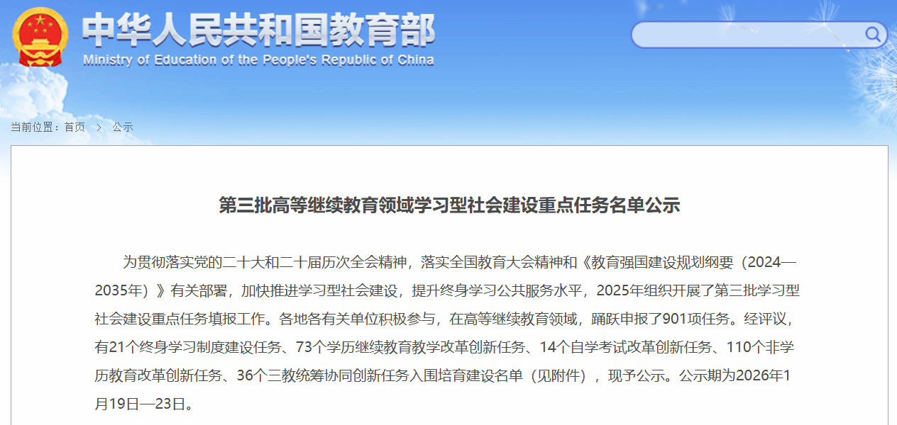近日,教育部公布第三批高等继续教育领域学习型社会建设重点任务名单,国产自拍